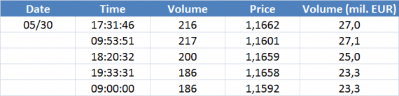 Největší obchody podle objemu na EURUSD (aktivní future kontrakt):