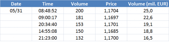 Největší obchody podle objemu na EURUSD (aktivní future kontrakt):
