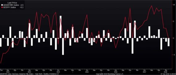 Německo dnes ráno zveřejnilo výsledky továrních objednávek, které daly obchodníkům další důvod k nervozitě. Objednávky se totiž v únoru propadly o 4,2 %, což byl nejhorší výsledek od začátku roku 2017. Co je možná ještě horší je ale skutečnost, že takto prudký pád následoval po již tak špatných lednových číslech, kdy objednávky klesly o 2,6 %. -