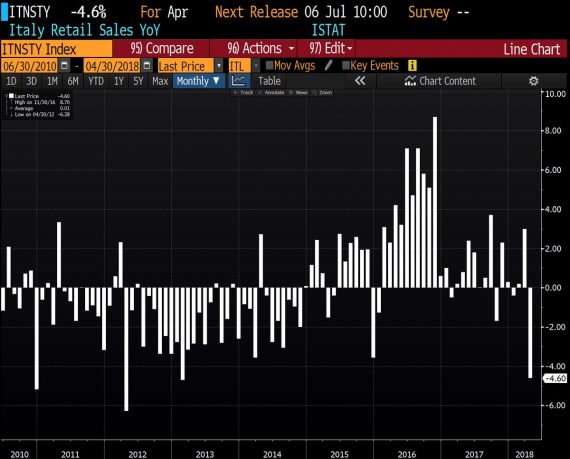 P.S.: Okrem Nemecka dnes prišlo slabšie číslo aj z Talianska. Maloobchodné tržby sa medziročne prepadli o 4,6%, čo bol najväčší medziročný pokles od roku 2013. Pokojne to môže byť jednorazový výkyv, ukazuje to však, že rast ekonomiky eurozóny v druhom kvartáli však bude pravdepodobne nič moc.