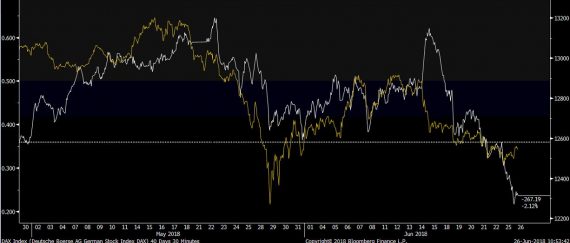 Jednou z hlavných príčin sú obavy z obchodných vojen, ktoré už prerástli do fázy, kedy sa riešia clá na európske automobily do USA, čo by rozhodne malo dopad na ekonomiku eurozóny. Obavy o dopady obchodných vojen na európsku ekonomiku reflektuje aj nemecký index DAX, s ktorým vykazujú výnosy z nemeckých dlhopisov v posledných týždňoch solídnu koreláciu.