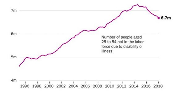 So zlepšujúcim sa trhom v práce v USA začína klesať počet postihnutých a chorých. Čiže časť ľudí, čo si pri vysokej nezamestnanosti za úplatky vybavili invalidné pečiatky, sa vracia na trh práce. Ten teda ešte má určitý priestor pre získavanie ďalších pracovníkov aj pri najnižšej nezamestnanosti za posledných 50 rokov (@NinjaEconomics):