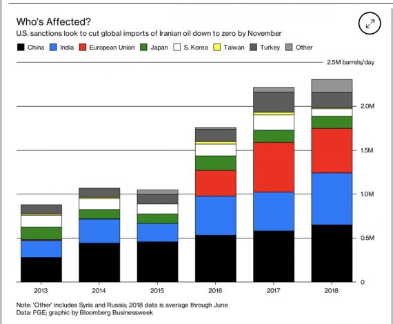 Štruktúra importov ropy z Iránu – každý z trojice Čína, India a EÚ dováža z krajiny viac ako 0,5 barelov denne. Ako je vidno z grafu, tak do roku 2016, teda počas predošlých sankcií, EÚ z Iránu ropu nedovážala nič a je možné, že kvôli hrozbám odpojenia firiem a bánk obchodujúcich s Iránom od biznisu v USA nebude dovážať ani teraz. Čínu pri aktuálnych obchodných sporoch však USA len ťažko dotlačia k tomu, aby ropu nedovážala za platby v barteri (@adam_tooze):