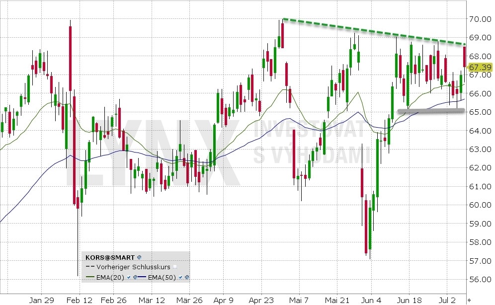 Agresivnější obchodníci mohou své nákupy uskutečnit již nad $69. Cena by se neměla znovu dostat pod linii $65. Další čtvrtletní výsledky nebudou zveřejněny až do konce srpna. Do té doby by nás neměla čekat žádná překvapení co se týká fundamentální stránky.