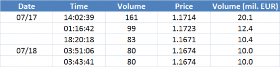 Největší obchody podle objemu na EURUSD (aktivní future kontrakt):