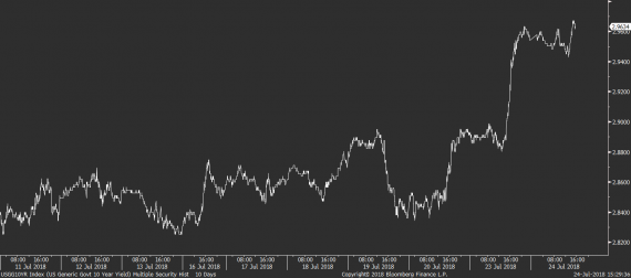 Na ostatních dolarových párech se situace oproti včerejšku nijak výrazně nemění. Na páru s komoditními měnami dolar jen mírně ztrácí, ale dál si na většině měnových párů své dřívější zisky udržuje. Pomáhá mu k tomu mj. i vyšší úroveň dluhopisových výnosů, které v tomto týdnu v USA začaly znovu růst a u 10 letých splatností se přehouply přes hranici 2,9 %.