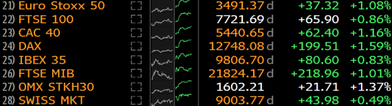 Evropské akciové indexy dnes uzavřel s výraznými zisky. Nejvíce si dnes připsal španělský IBEX 35 (SPA35), který vzrostl o 2,37 %. Německý blue chip index DAX (DE30) získal 1,70 % a seanci ukončil na 12 649 bodech. Index pražské burzy PX (CZKCASH) odepsal 0,27 % a uzavřel na 1 144,01 bodech.