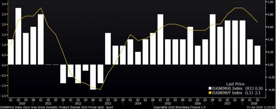 HDP sklamalo. Medzikvartálne rástla ekonomika eurozóny o 0,3%. Čakal sa rast o 0,4%. Medziročný rast spomalil z 2,5% na 2,1%. Spomalenie teda pokračuje aj v druhom kvartáli. A to aj napriek tomu, že niektoré dáta, predovšetkým z Nemecka, sa zlepšili. Je možné, že ešte dôjde k revízii smerom nahor. Každopádne, podľa prvého odhadu dorovnal medzikvartálny rast najnižšiu úroveň od roku 2014 a medziročný rast je najnižší od prvého kvartálu 2017.