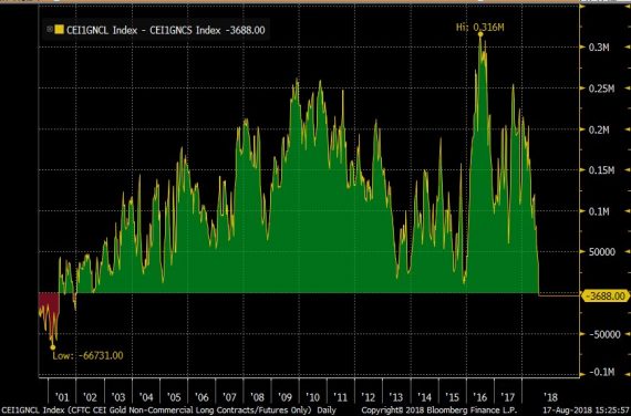 Vývoj rozdielu medzi long a short kontraktmi na zlato podľa CFTC (graf od @pboockvar)