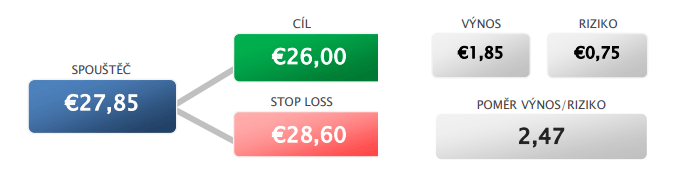Short obchod budeme otevírat na hodnotě €27,85, což je minimum poledního dne a s profitem plánujeme mířit na hodnotu €26,00. Stop-loss pokládáme nad zobrazenou rezistenci.