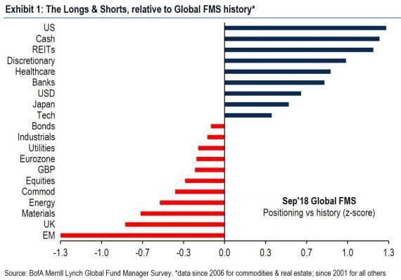 Aktuálny prieskum medzi globálnymi fondmi potvrdil mimoriadne negatívnu náladu voči aktívam emerging ekonomík. V porovnaní s historickým priemerom sú fondy najviac skeptické práve voči ich aktívam. Na poslednom mieste tak vystriedali Britániu, ktorá tieto priečky už dlhodobo okupuje kvôli BrExitu. Najoptmistickejší ostávajú voči americkým aktívam (@Callum_Thomas):