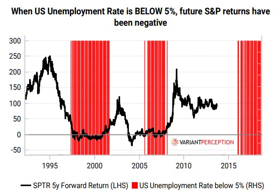 Keď klesne nezamestnanosť v USA pod 5%, tak priemerný zisk na americkom akciovom trhu v najbližších piatich rokoch klesá k nule. Pokiaľ by tento vzťah mal pokračovať aj v budúcnosti, tak by mali mať akciové trhy ešte zhruba dva roky do ďalšieho prepadu (@VrntPerception):