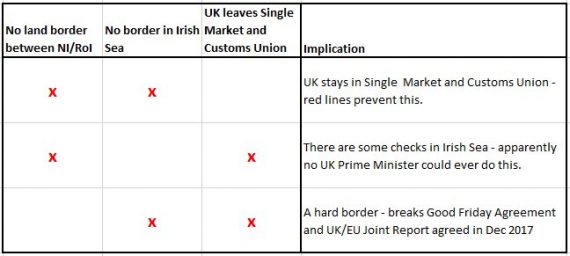 Začnime tým, že aké má krajina aktuálne možnosti. V skrate ide o to, že z troch cieľov, ktoré chce dosiahnuť – žiadna hranica medzi Írskom a Severným Írskom (čo je podmienka mierovej zmluvy so severoírskymi separatistami), žiadna hranica medzi Severným Írskom a zvyškom Británie a voľný prístup na trhy EÚ, sú naraz splniteľné len dva.