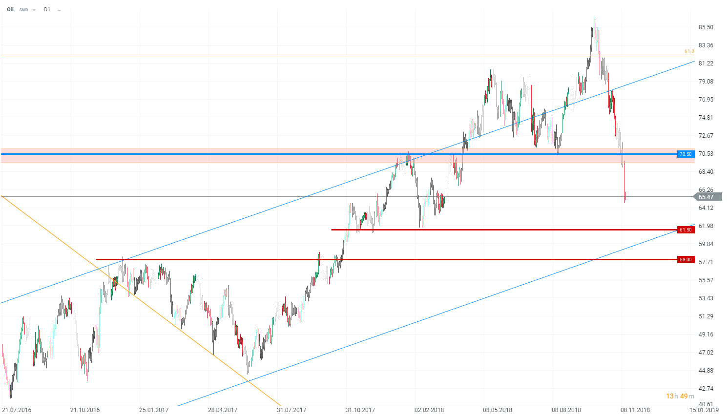OIL.WTI je zpátky na úrovních z poloviny roku 2017, protože na něj rostoucí americká produkce doléhá více než na Brent (OIL). Jedná se o velmi významnou úroveň, která by mohla pomoci býkům získat znovu pevnější půdu pod nohama. Pokles byl ale tak silný, že by se obchodníci měli zaměřit nejen na cenu samotnou, ale i na signály o skutečném růstu poptávky.